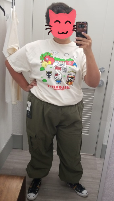 i was able to find a SUPER cute hello kitty shirt, and these baggy pants. i have been in search for some baggy pants for MONTHS now, and i was so happy i was able to find these at a decent price AND that fit me very nicely!!!!