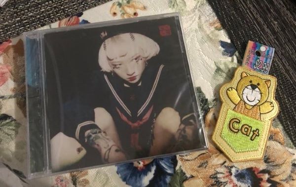serotonin II jewel case alongside a stupid (lovingly) baby cat patch i bought for some overalls i have!