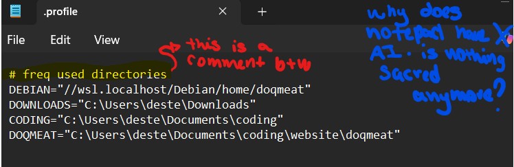 ~/.profileyou can set up variables for paths you frequently use.img of my .profile, you can use them in the terminal as variables using this$symbol. example:cd $DOQMEAT