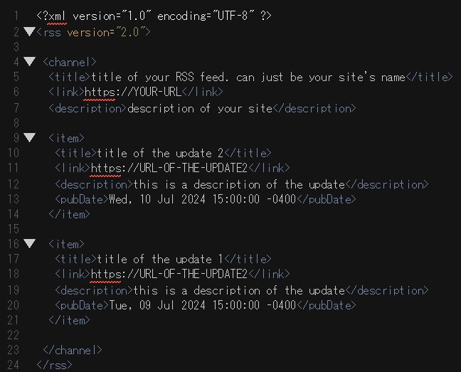 this will be the template you will use for it. this template has what is required for an RSS feed to function. here are some other optional tags you can also use on your feed, for now i will only work with what's required.